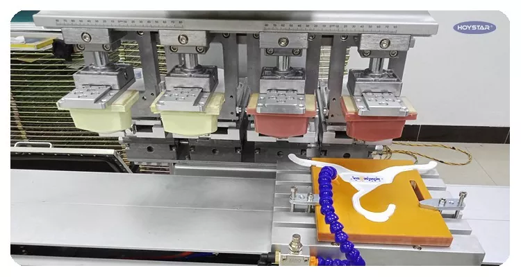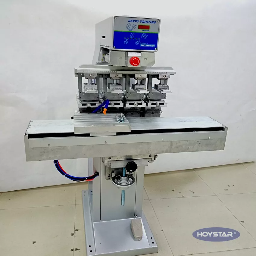 स्टॉपिंग शटल वर्कटेबल और 4 प्रिंटिंग हेड के साथ 4 कलर पैड प्रिंटिंग मशीन, मशीन को चार हेड के साथ 1 कलर पैड प्रिंटर के रूप में इस्तेमाल किया जा सकता है।