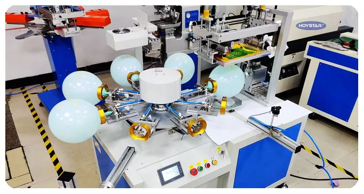 HOYSTAR चीन में एक विश्वसनीय निर्माता और आपूर्तिकर्ता है; यह HOYSTAR सिंगल कलर लेटेक्स बैलून स्क्रीन प्रिंटिंग मशीन लेटेक्स गुब्बारों पर प्रिंटिंग के लिए डिज़ाइन की गई है। रोटरी वर्कटेबल, स्वचालित ब्लोइंग, स्वचालित घूर्णन, स्वचालित सुखाने, स्वचालित अनलोडिंग कार्यों से सुसज्जित। पीएलसी टच स्क्रीन नियंत्रण, सुरक्षित, सहज संचालन के लिए उपयोगकर्ता के अनुकूल इंटरफेस। मशीन गति, सटीकता और उपयोग में आसानी को जोड़ती है।